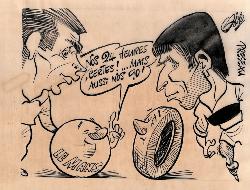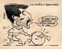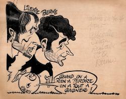 | Dessin original de MASSON ET BARON (DIJON FOOTBALL CÔTE D'OR) signé Pierre Rollot dit SIRO (1914-2005) à l'encre sur papier calque. Format 16x21 cm. Bon état.