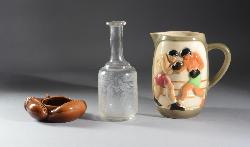 ENSEMBLE COMPORTANT UNE CARAFE, UN PICHET ET UN CENDRIER SUR LE THÈME DE LA BOXE. État d'usage. |