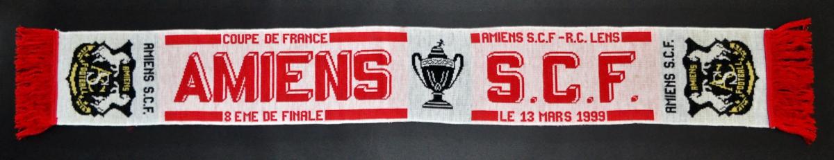 Echarpe Football du match de Coupe de France 1999 opposant Amiens SC au Racing Club de Lens. Bon état.