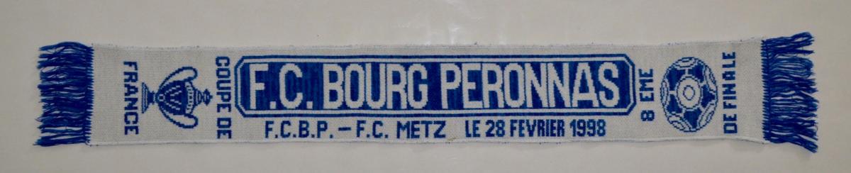 Écharpe Football du match de Coupe de France 1998 opposant le FC BOURG PERONNAS au FC METZ. Bon état.
