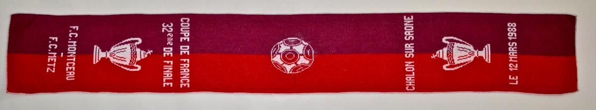 Écharpe Football du match de Coupe de France 1988 opposant le F.C. Montceau au F.C. Metz. Bon état.