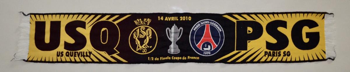Écharpe Football du match de Coupe de France 2010 opposant l'US Quevilly au Paris Saint Germain. Bon état.