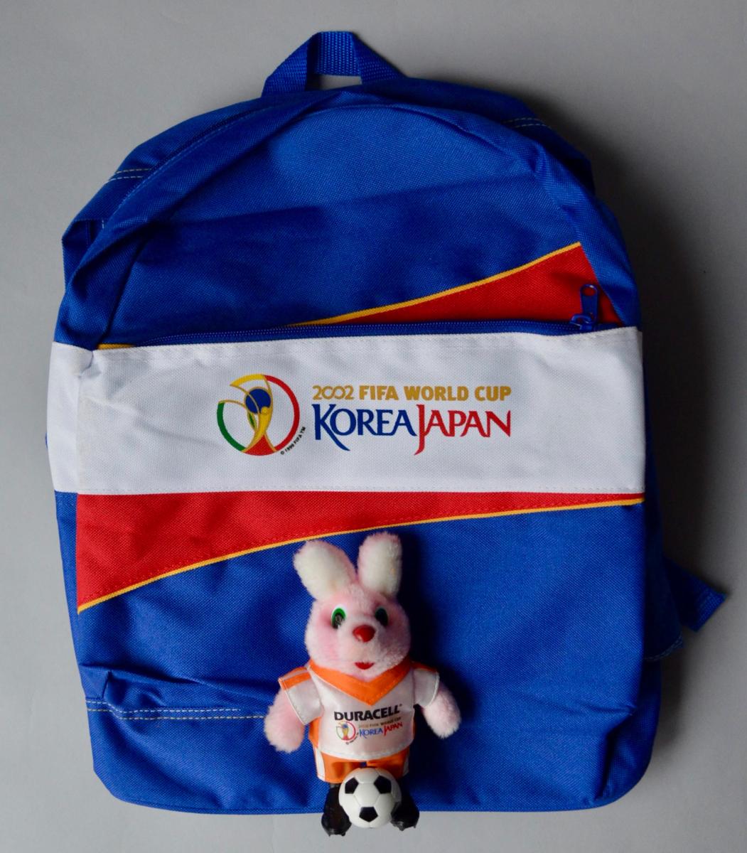 Lot de 2 produits officiels de la COUPE DU MONDE FOOTBALL CORÉE JAPON 2002, Composé d'un sac à dos et d'une mascotte lapin Duracell.