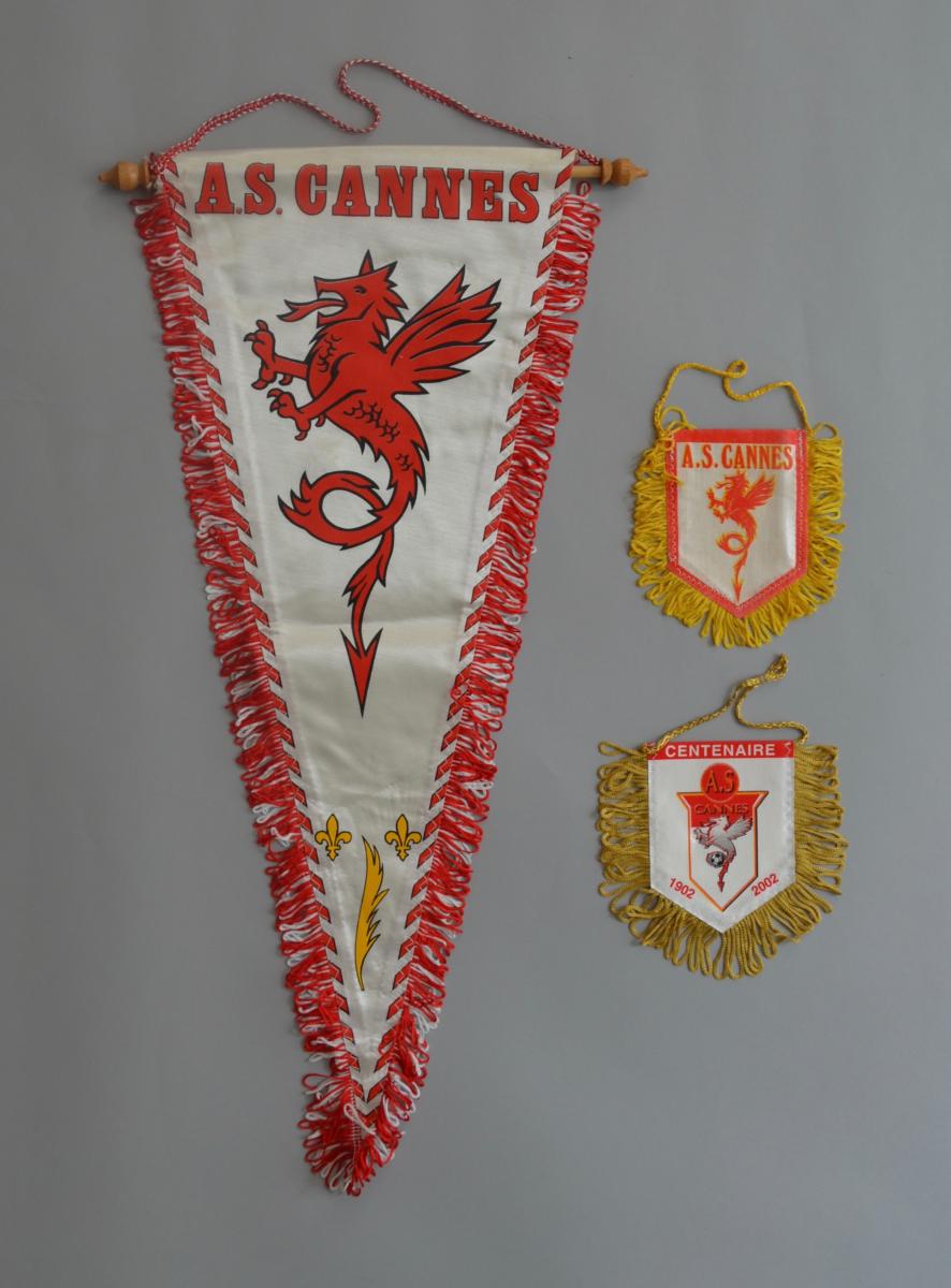 Fanions de l'AS CANNES. Dimensions 51,5 x 23 cm + Dimensions 10 x 9 cm. État d'usage.