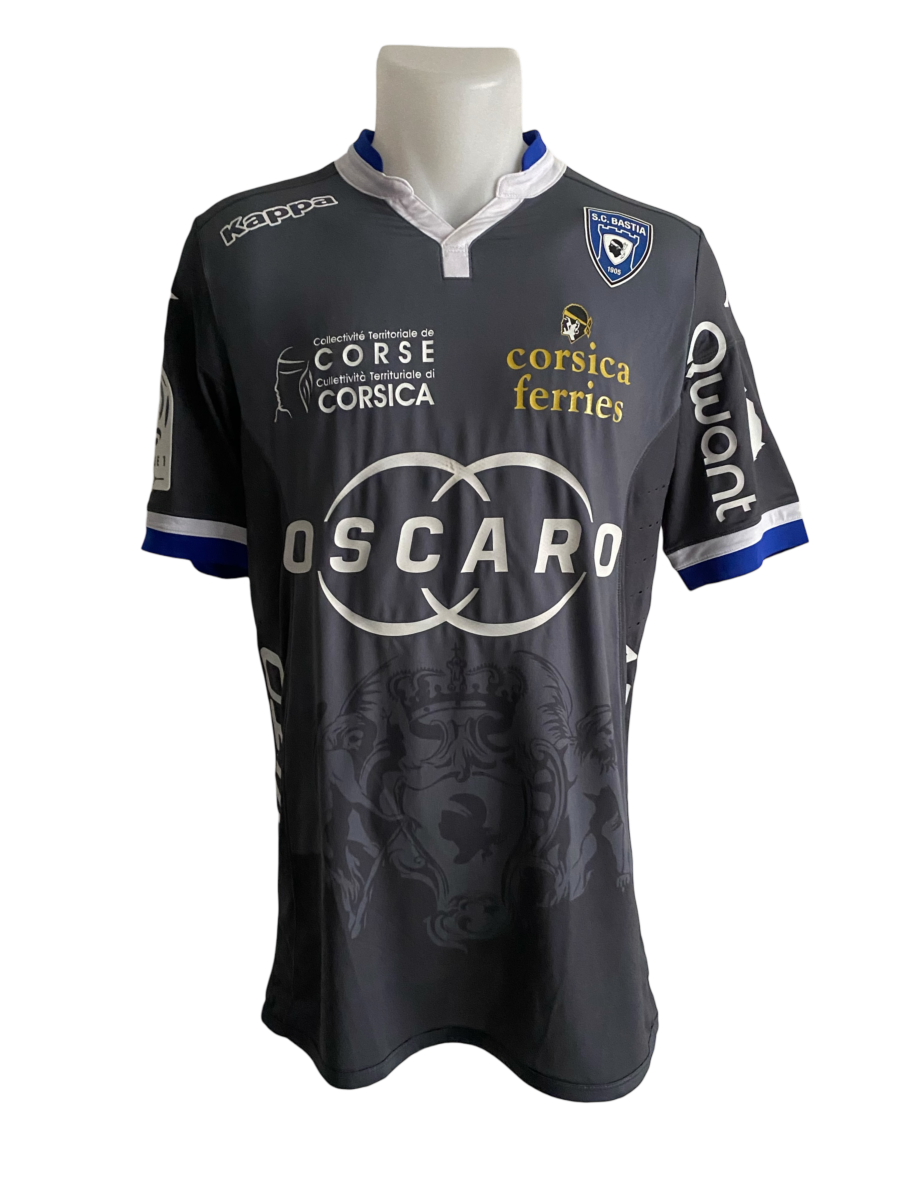 Maillot N°9 du Sporting Club de Bastia préparé pour la saison 2015-2016 du championnat de France de Ligue 1. Match à déterminer. Le joueur joue 11 matchs. Marque Kappa. Taille L.