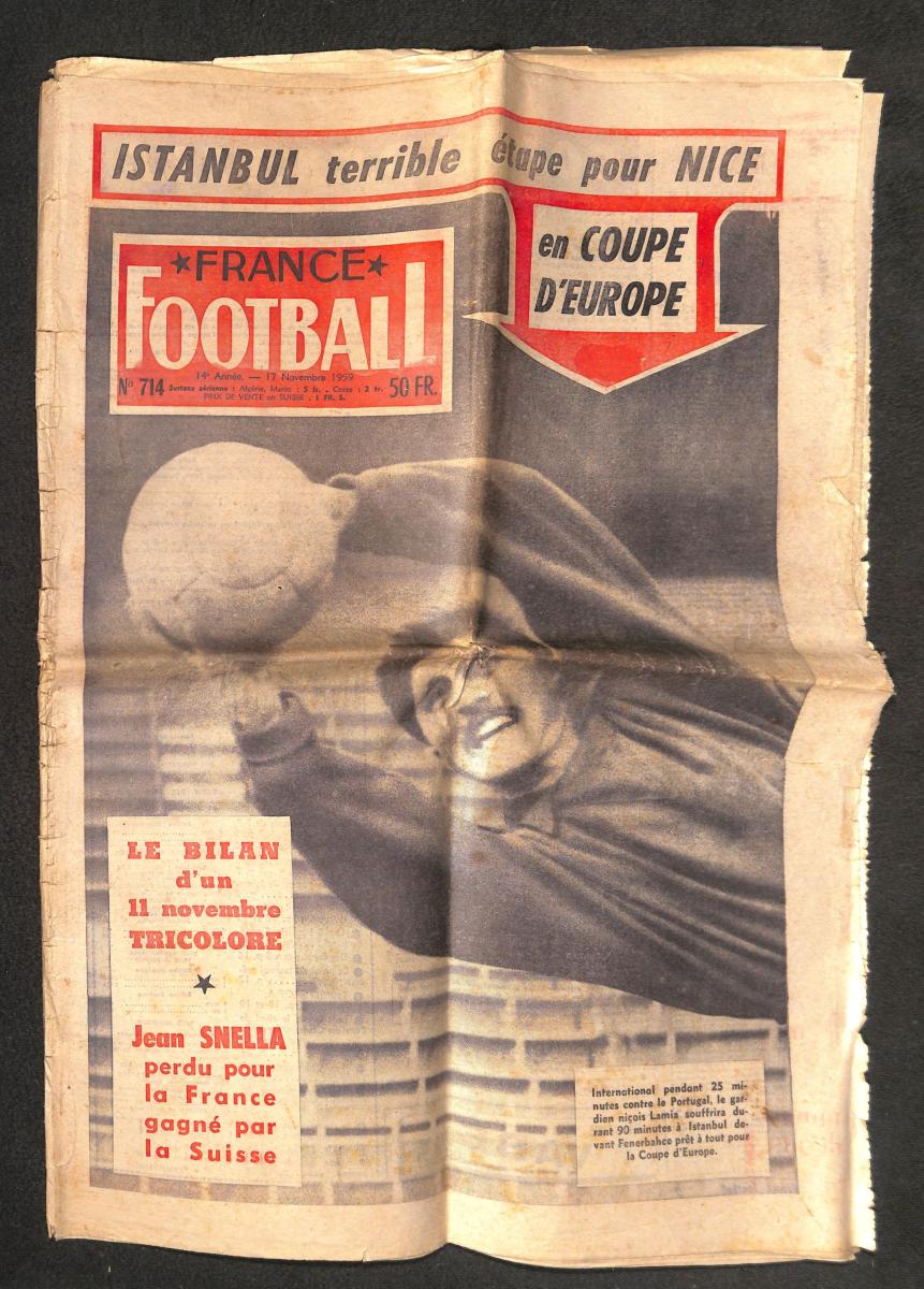 FRANCE FOOTBALL N°714 LE 17 NOVEMBRE 1959. État d'usage (traces d'humidité, déchirures ou manques peuvent être présents ; journal plié en quatre).
