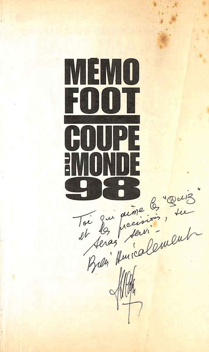 GUIDE « MÉMO FOOT » SPÉCIAL COUPE DU MONDE 1998 (DÉDICACE À T. ROLAND). Format 12,8x21 cm. État d'usage.