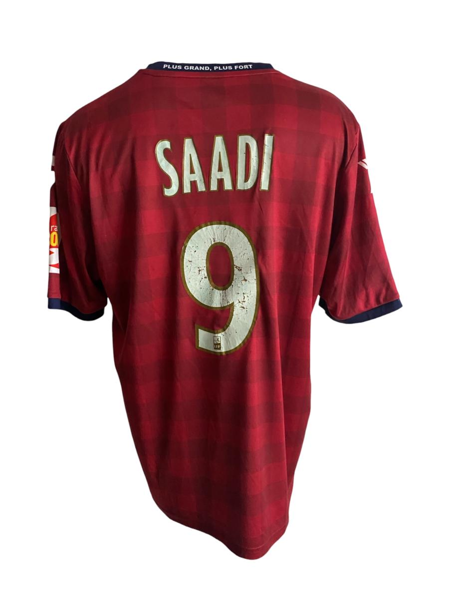 Maillot N°9 du Clermont Foot 63 porté lors de la saison 2014-2015 du championnat de France de Ligue 2. Match à déterminer. Le joueur joue 21 matchs. Flocage arrière en état moyen. Marque Patrick. Taille M.