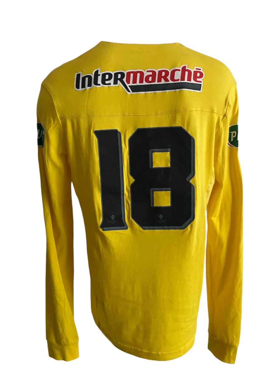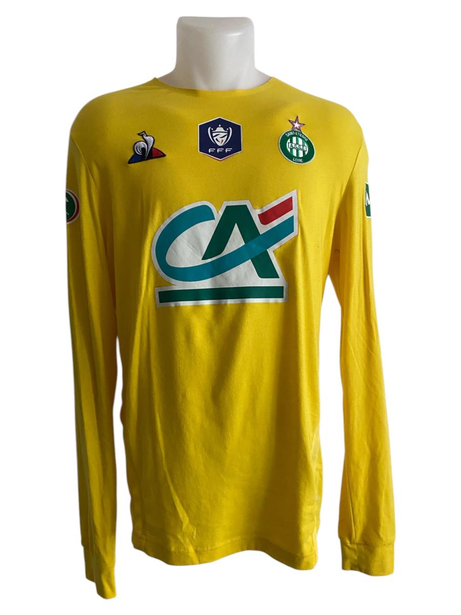 Maillot N°18 de l'AS Saint-Étienne préparé pour le 32ème de finale de la Coupe de France face à l'Olympique de Strasbourg le 6 janvier 2019. Le joueur est remplaçant. Marque Le Coq Sportif. Taille L.