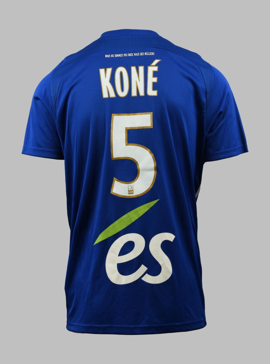 Défenseur. Maillot N°5 du Racing Club de Strasbourg préparé pour la saison 2018-2019 du Championnat de France de Ligue 1. Le joueur participe à 27 rencontres. Match à déterminer. Marque Adidas. Modèle Climacool. Fabriqué en Thaïlande. Taille L. Maillot préparé (match issued shirt).