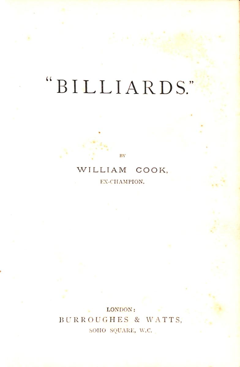 LIVRE "BILLIARDS" BY W. COOK EX-CHAMPION ÉDITION DE 1891 LONDON BURROUGHES & WATTS. NOMBREUSES PLANCHES COULEURS DE COUPS. 280 PAGES. État d'usage (quelques pages volantes et rousseurs).
