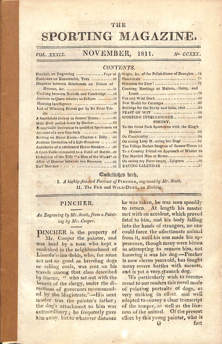 LIVRE « THE SPORTING MAGAZINE » NOVEMBER, 1811 (VOL. XXXIX / N°. CCXXX). Format 13x20 cm. État d'usage.
