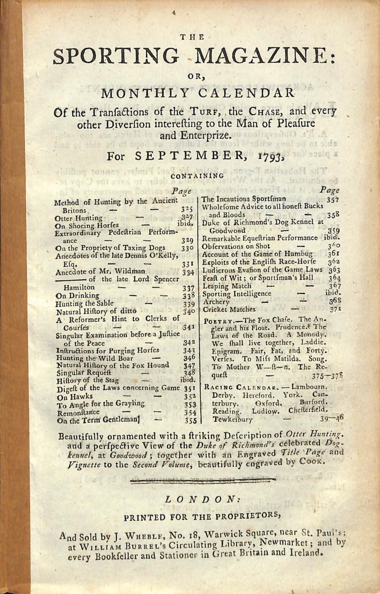 LIVRE « THE SPORTING MAGAZINE OR MONTHLY CALENDAR » FOR SEPTEMBER, 1793 (LONDON). Format 13x20,5 cm. État d'usage.
