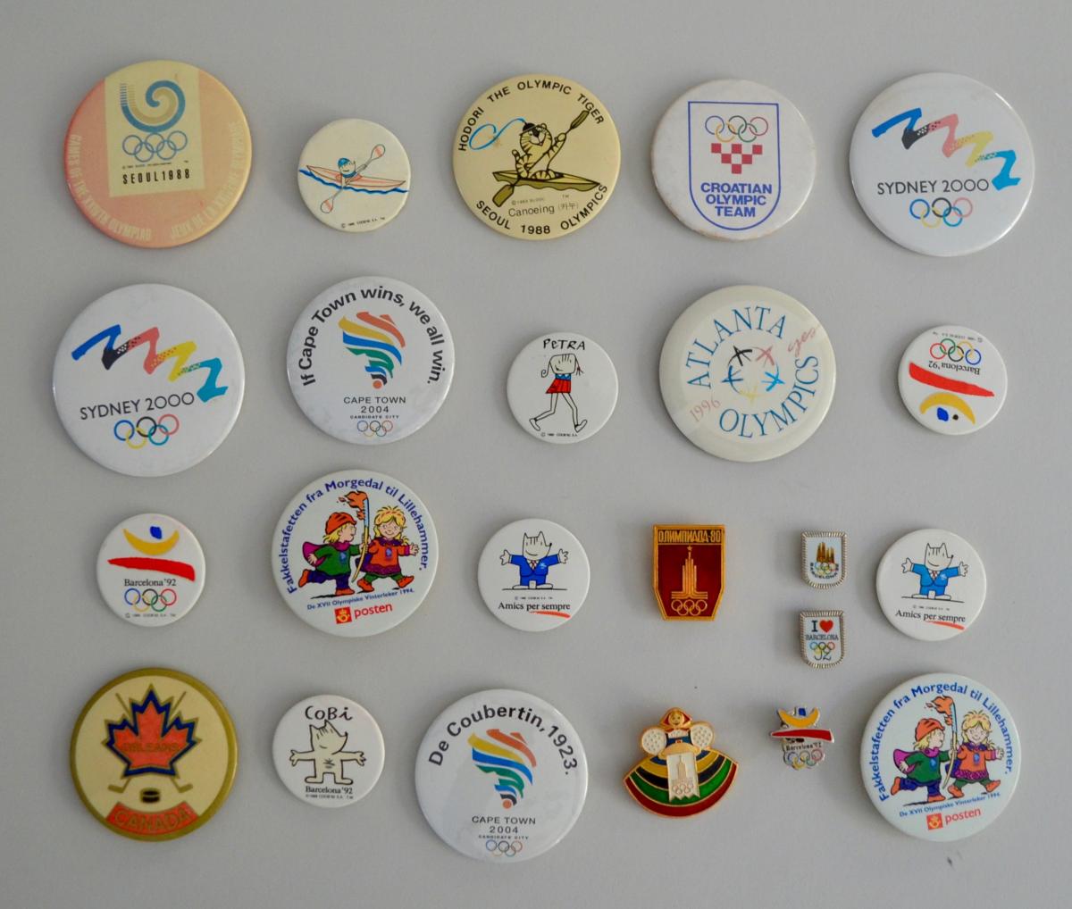 Lot de 22 badges de diverses olympiades et de villes candidates.