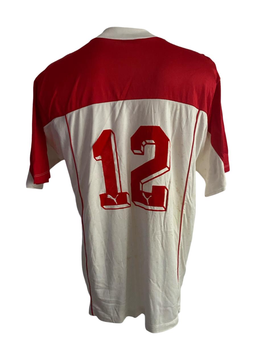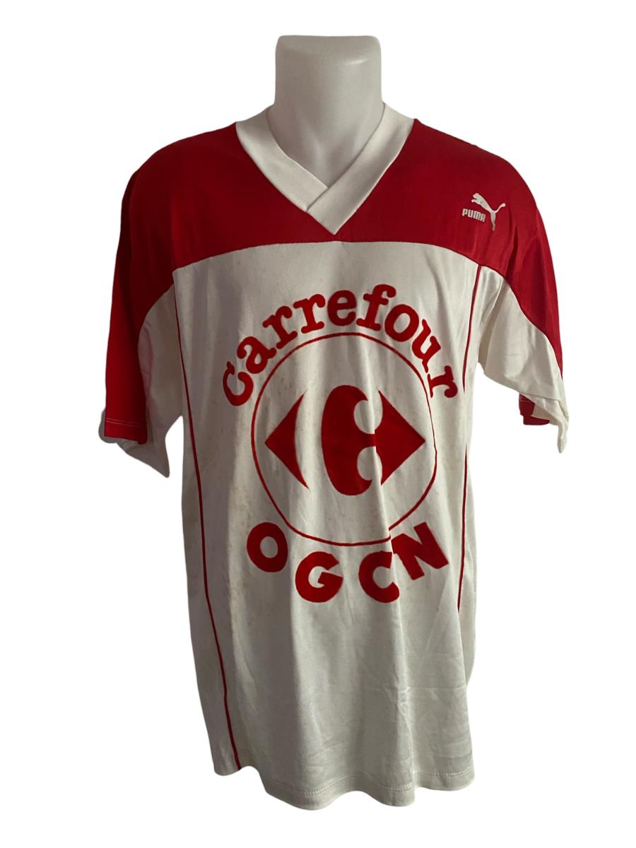 Maillot N°12 de l'OGC Nice porté lors de la période 1983-1985. Joueur à identifier et compétition à déterminer. Marque Puma. Taille 4/5.