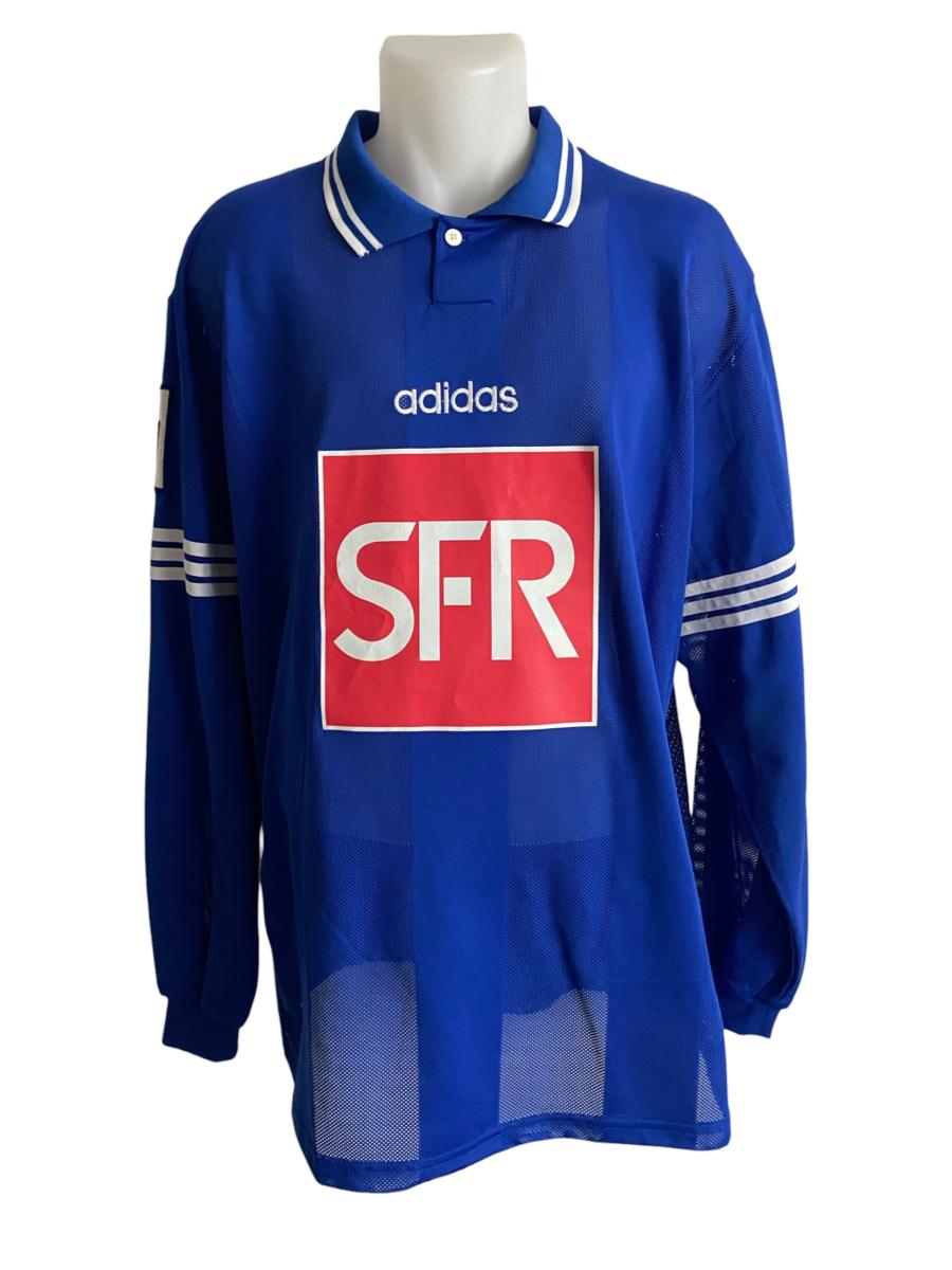 Maillot N°17 du Perpignan FC préparé pour le 32ème de finale de la Coupe de la Ligue face au SAS Épinal le 23 octobre 1996. Joueur à identifier. Marque Adidas. Taille XL.