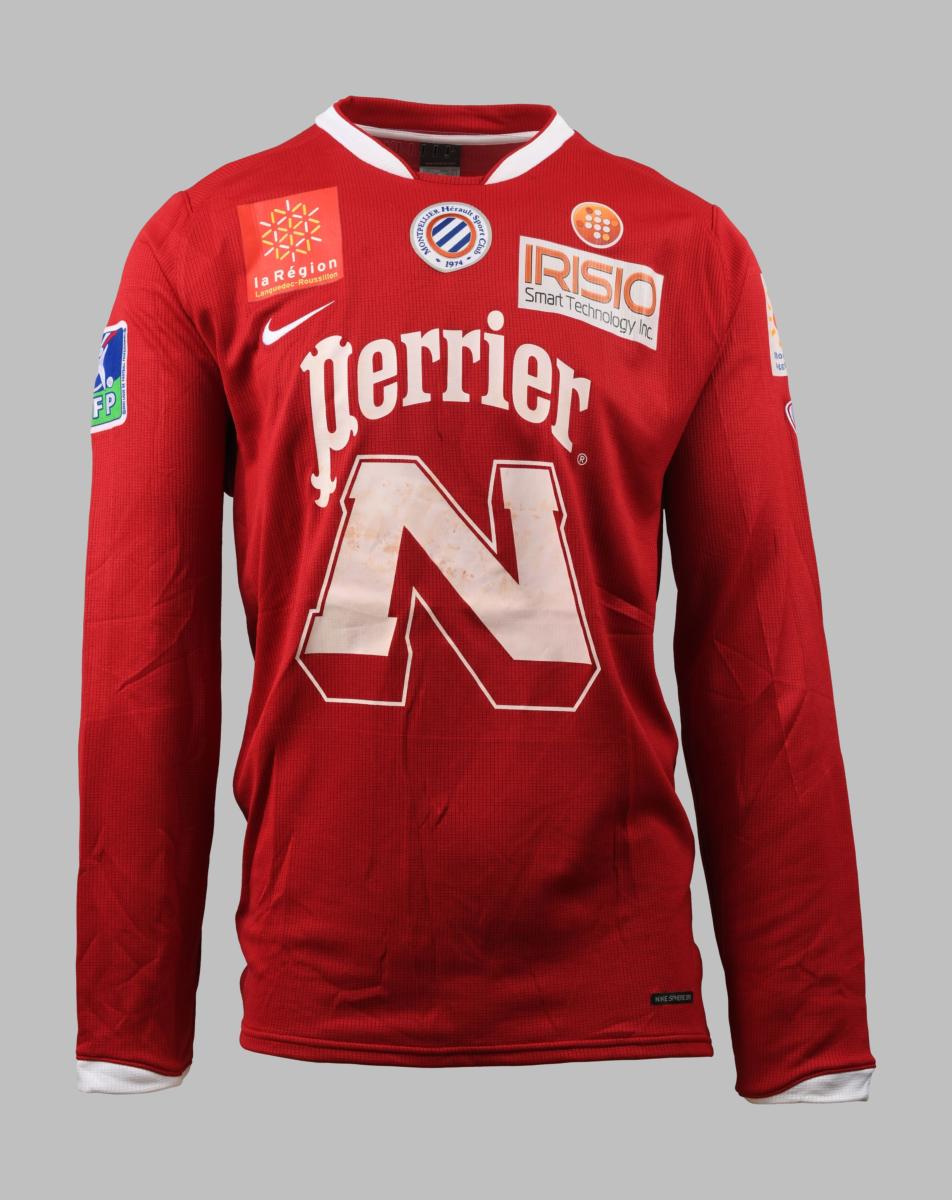 Défenseur. Maillot N°26 du Montpellier Hérault Sport Club porté lors de la saison 2006-2007 du Championnat de France de Ligue 2. Le joueur participe à 25 rencontres. Match à déterminer. Marque Nike. Modèle Sphere Dry. Fabriqué en Thaïlande. Taille L. Maillot porté (match worn shirt).