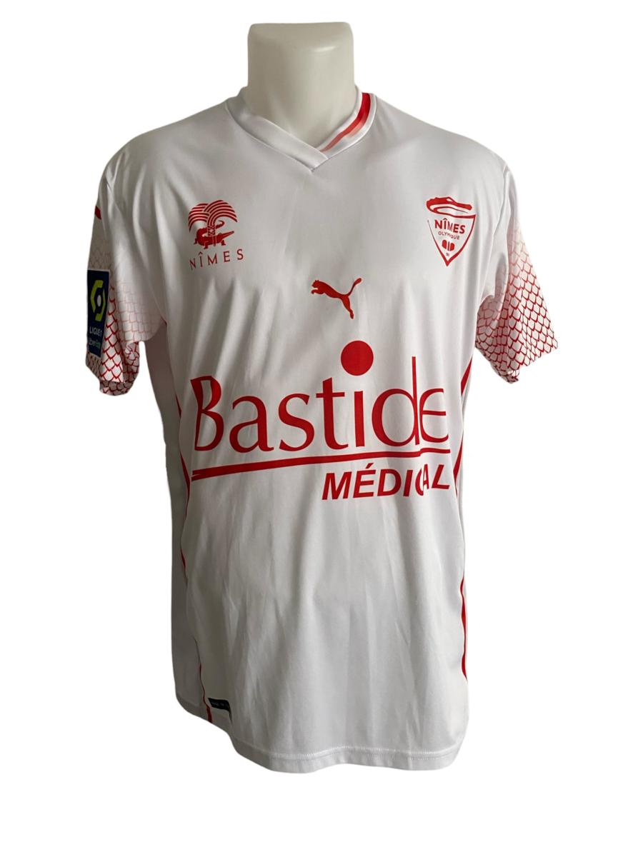 Maillot N°4 du Nîmes Olympique préparé pour la saison 2020-2021 du championnat de France de Ligue 1. Match à déterminer. Le joueur joue 7 matchs. Marque Puma. Taille L.