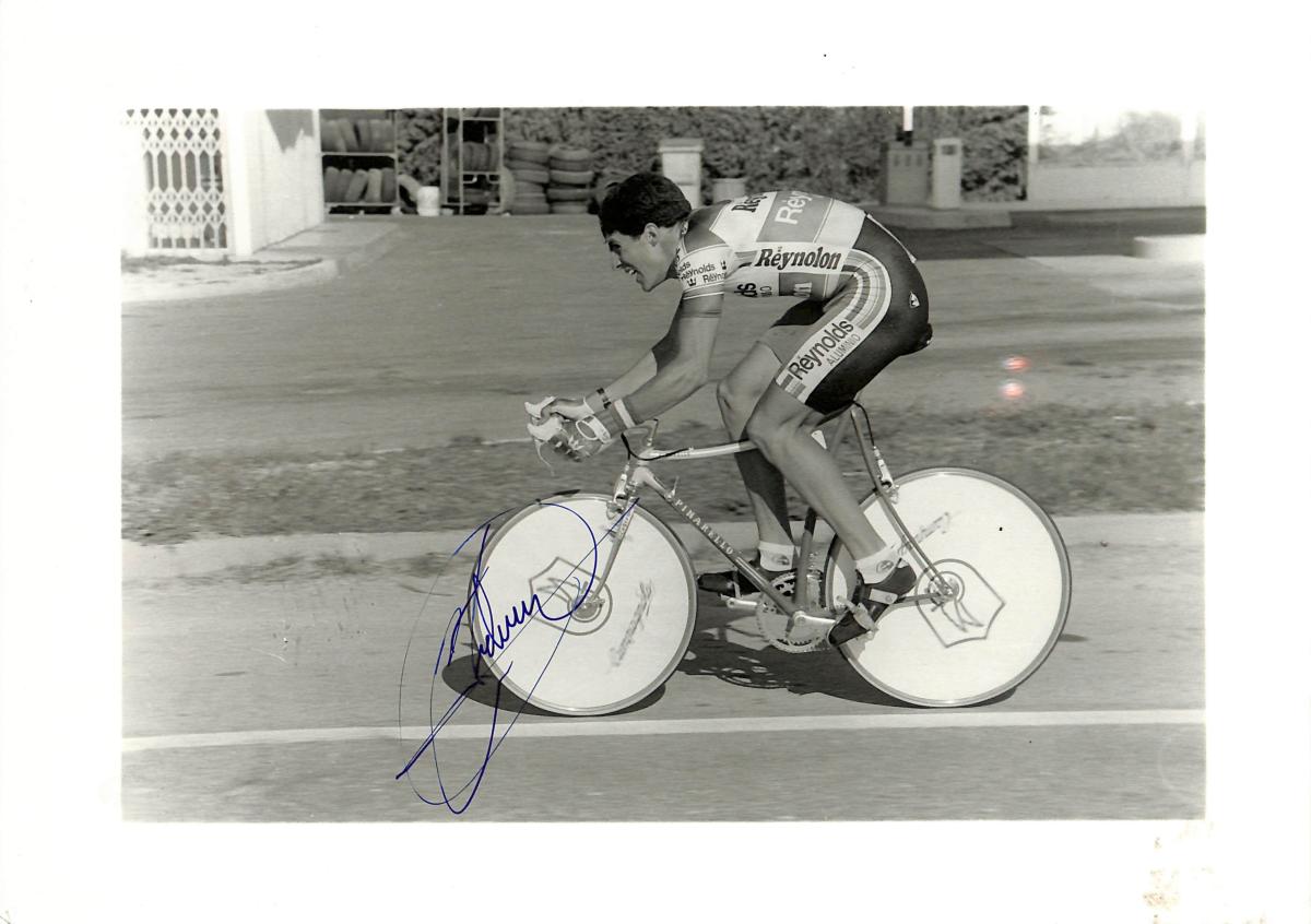 PHOTO ORIGINALE DE PRESSE DE MIGUEL INDURAIN (CYCLISME) AVEC AUTOGRAPHE DU COUREUR. Format 21x29,7 cm. Bon état d'usage.