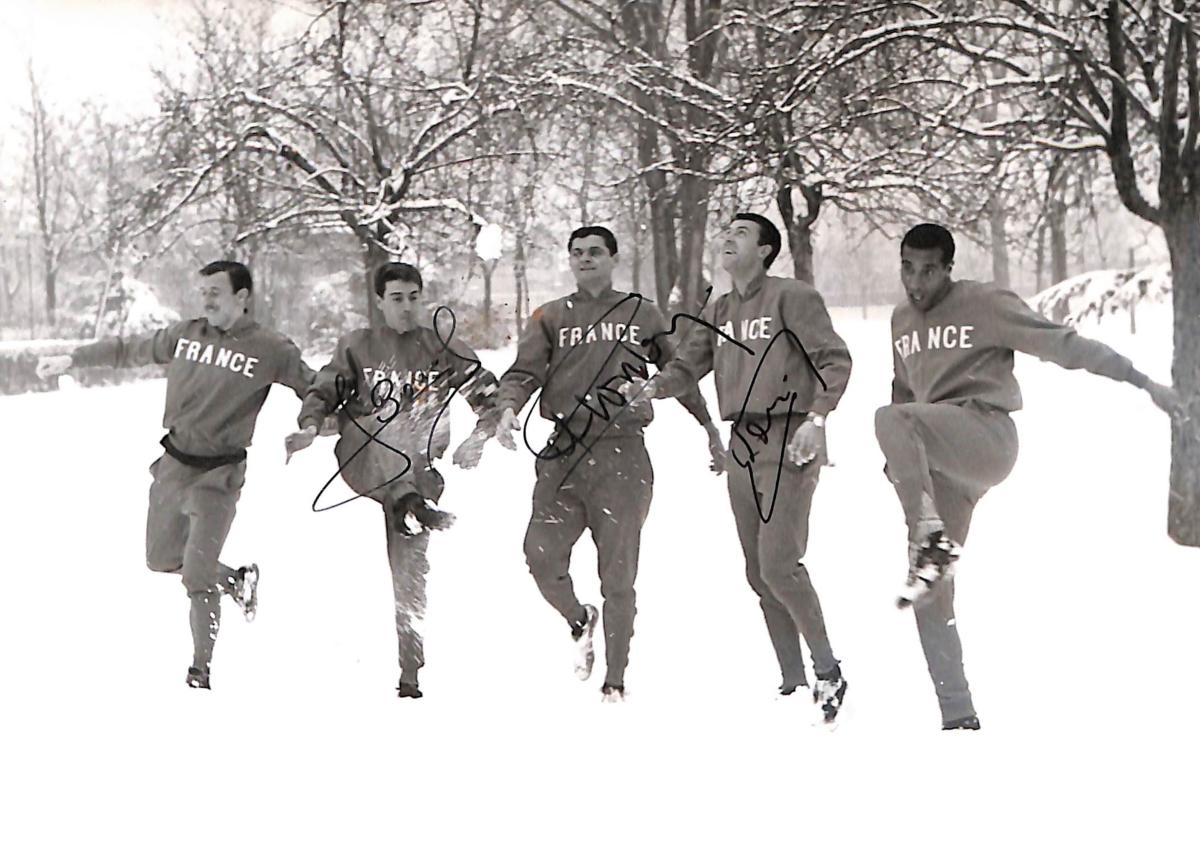 PHOTO ORIGINALE DE PRESSE AUTOGRAPHIÉE PAR 3 JOUEURS DE L'ÉQUIPE DE FRANCE SOUS LA NEIGE LE 20 FÉVRIER 1963. Format 18 x 13 cm. Bon état.