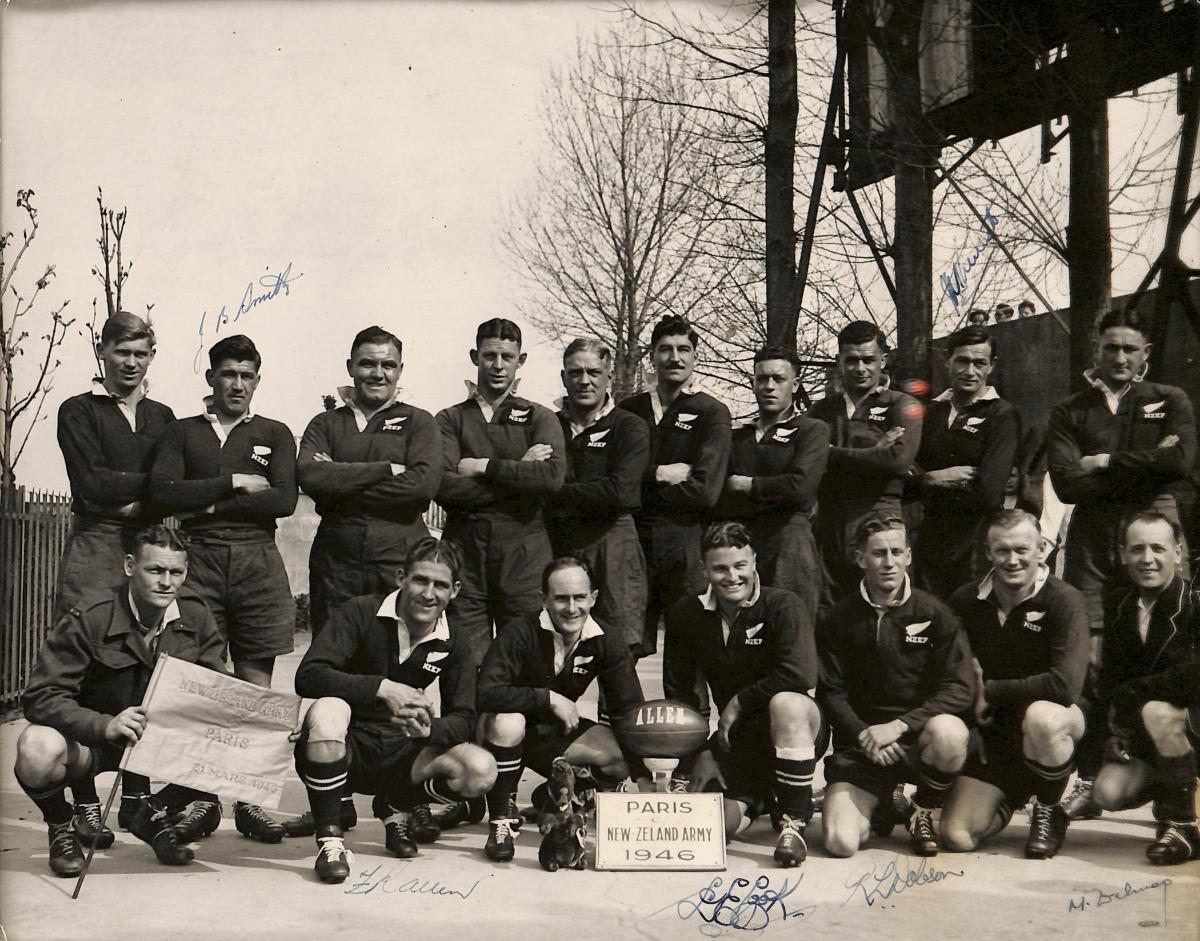 PHOTO ORIGINALE DE PRESSE AUTOGRAPHIÉES DE LA NEW ZELAND ARMY (NOUVELLE-ZÉLANDE) EN 1946 À PARIS. Format 24x30,5 cm. Bon état d'usage.