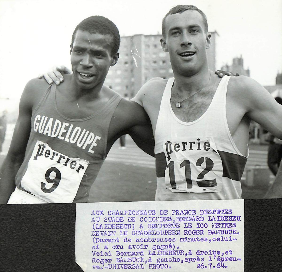 PHOTO ORIGINALE DE PRESSE DE BAMBUCK ET LAIDEBEUR (100 MÈTRES) LE 26 JUILLET 1964. Format 18 x 13 cm. Bon état.