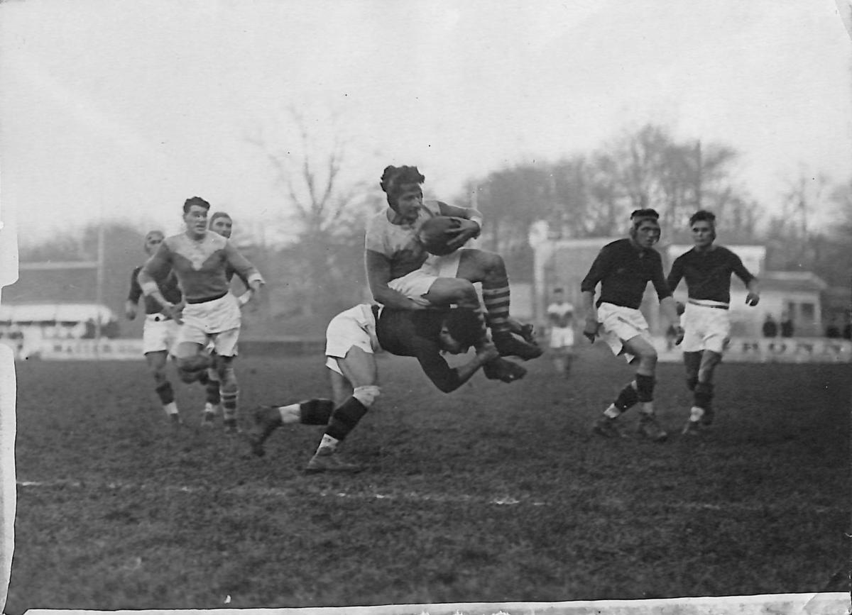 PHOTO ORIGINALE DE PRESSE D'UN PLAQUAGE EN MATCH DE RUGBY AU STADE BERGEYRE AVEC L'OLYMPIQUE DE TOULON (PHOTO MEURISSE). Format 13x18 cm. Bon état d'usage.