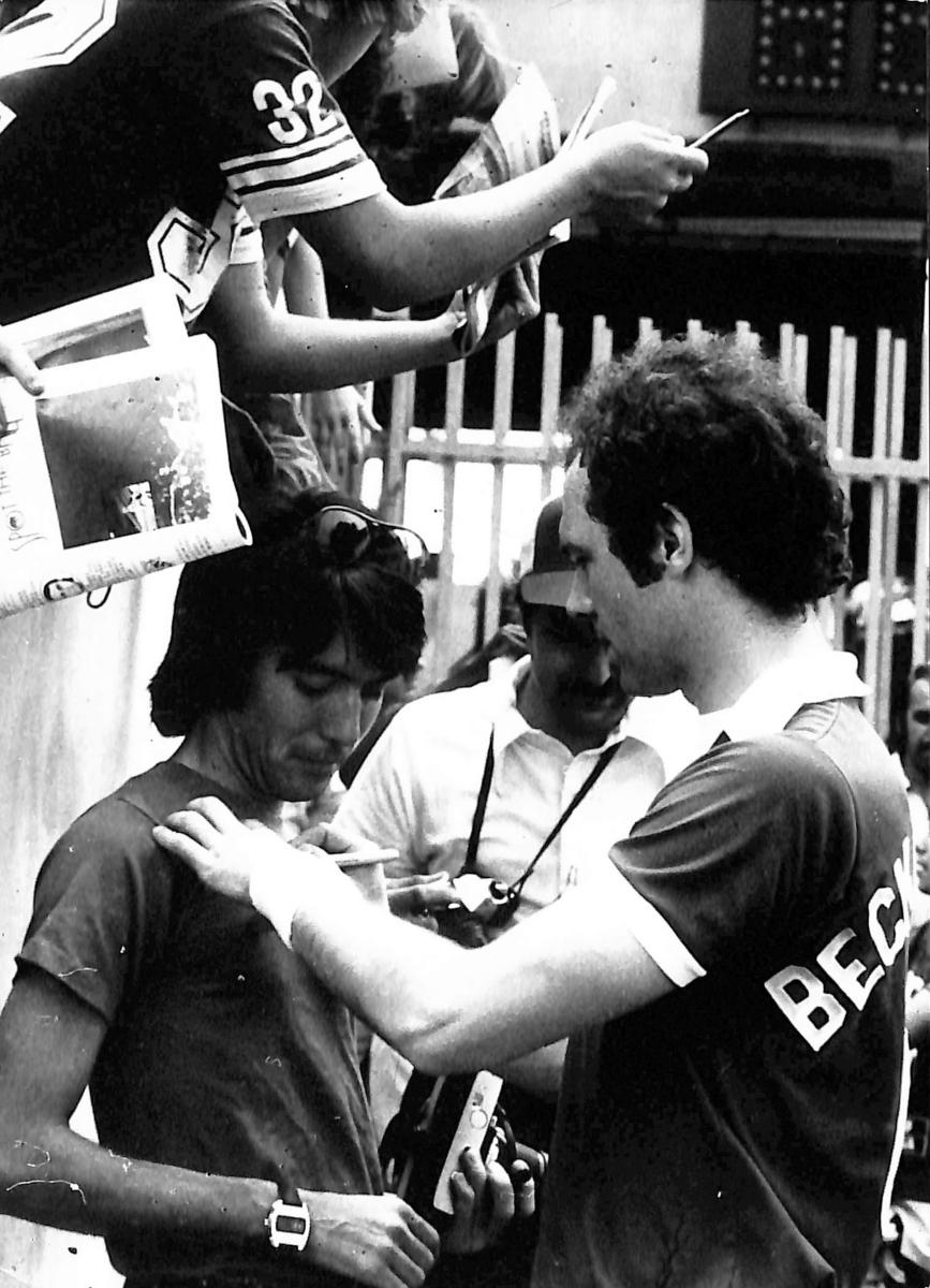 PHOTO ORIGINALE DE PRESSE DE FRANZ BECKENBAUER AVEC UN FAN EN LUI SIGNANT DESSUS. Format 13x18 cm. Bon état d'usage.