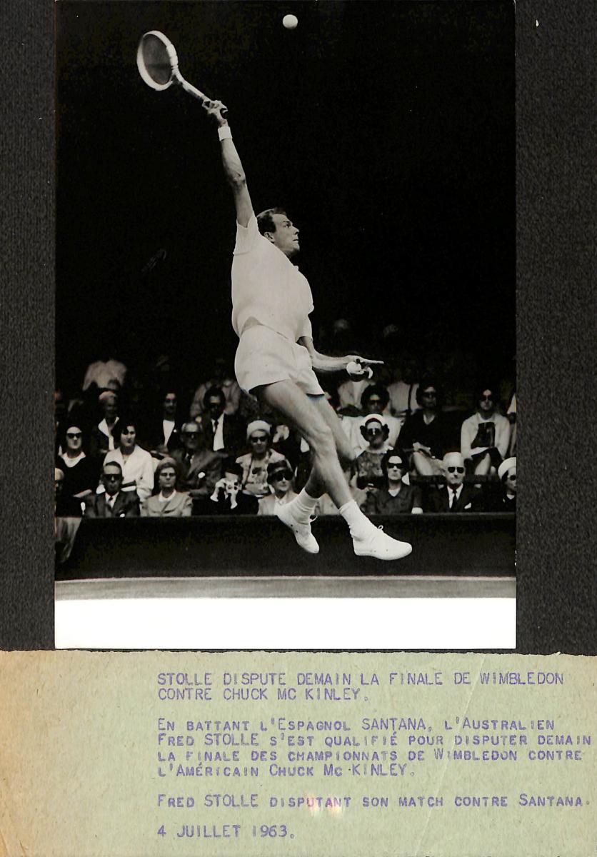 PHOTO ORIGINALE DE PRESSE DE FRED STOLLE BATTANT MANUEL SANTANA POUR ATTEINDRE LA FINALE LE 4 JUILLET 1963. Format 13 x 18 cm. Bon état.