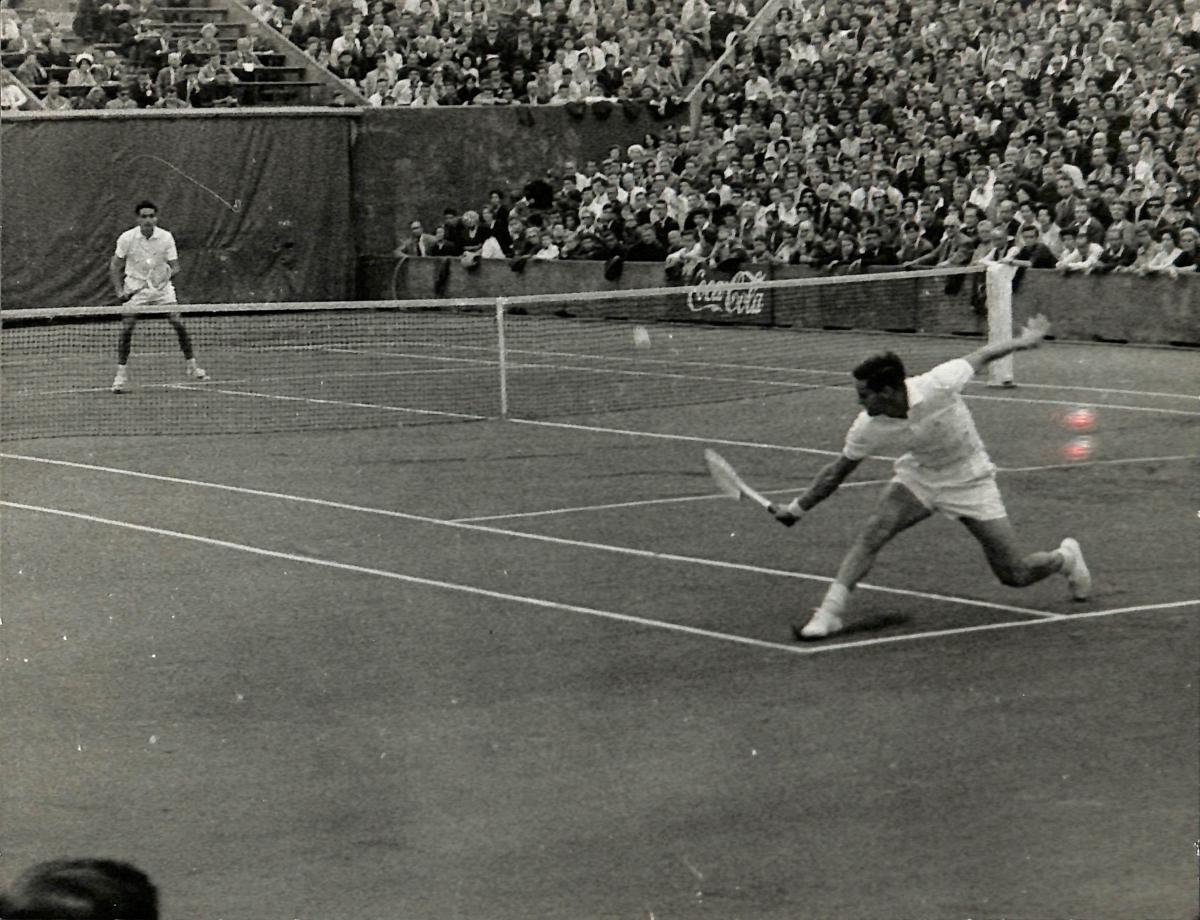 PHOTO ORIGINALE DE PRESSE DE ROY EMERSON ET FRED STOLLE EN FINALE DE WIMBLEDON DU 2 JUILLET 1964. Format 24 x 18 cm. Bon état.