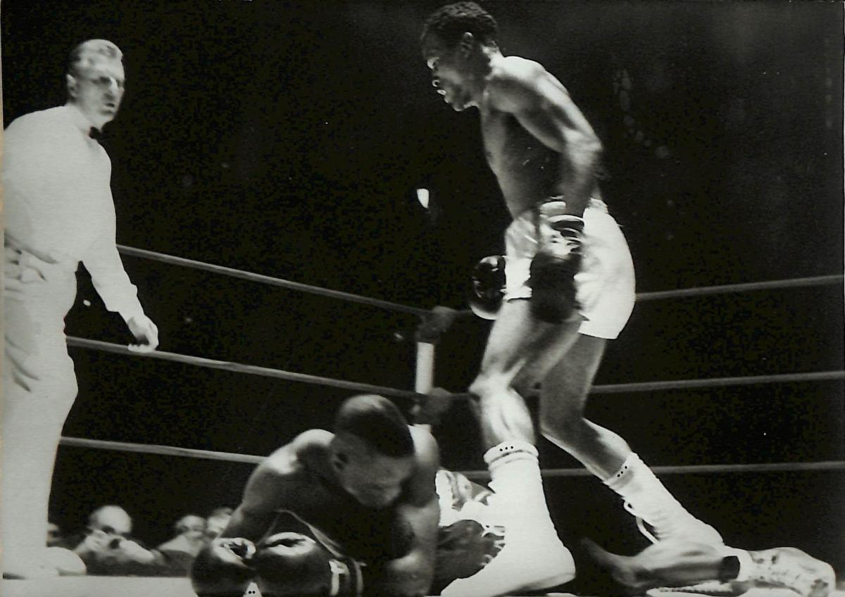 PHOTO ORIGINALE DE PRESSE DU COMBAT ENTRE ANGEL GARCIA ET RAY ADIGUN À TERRE (BOXE) LE 14 AVRIL 1964. Format 18 x 13 cm. Bon état.