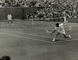 PHOTO ORIGINALE DE PRESSE DE ROY EMERSON ET FRED STOLLE EN FINALE DE WIMBLEDON DU 2 JUILLET 1964. Format 24 x 18 cm. Bon état.