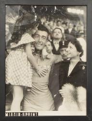 PHOTO ORIGINALE DE PRESSE DE LOUISON BOBET MAILLOT JAUNE AVEC SA FEMME ET LEUR FILLE ANNÉES 50. Rare Format 30 x 40 cm. État moyen (quelques déchirures, pliures et manques). |