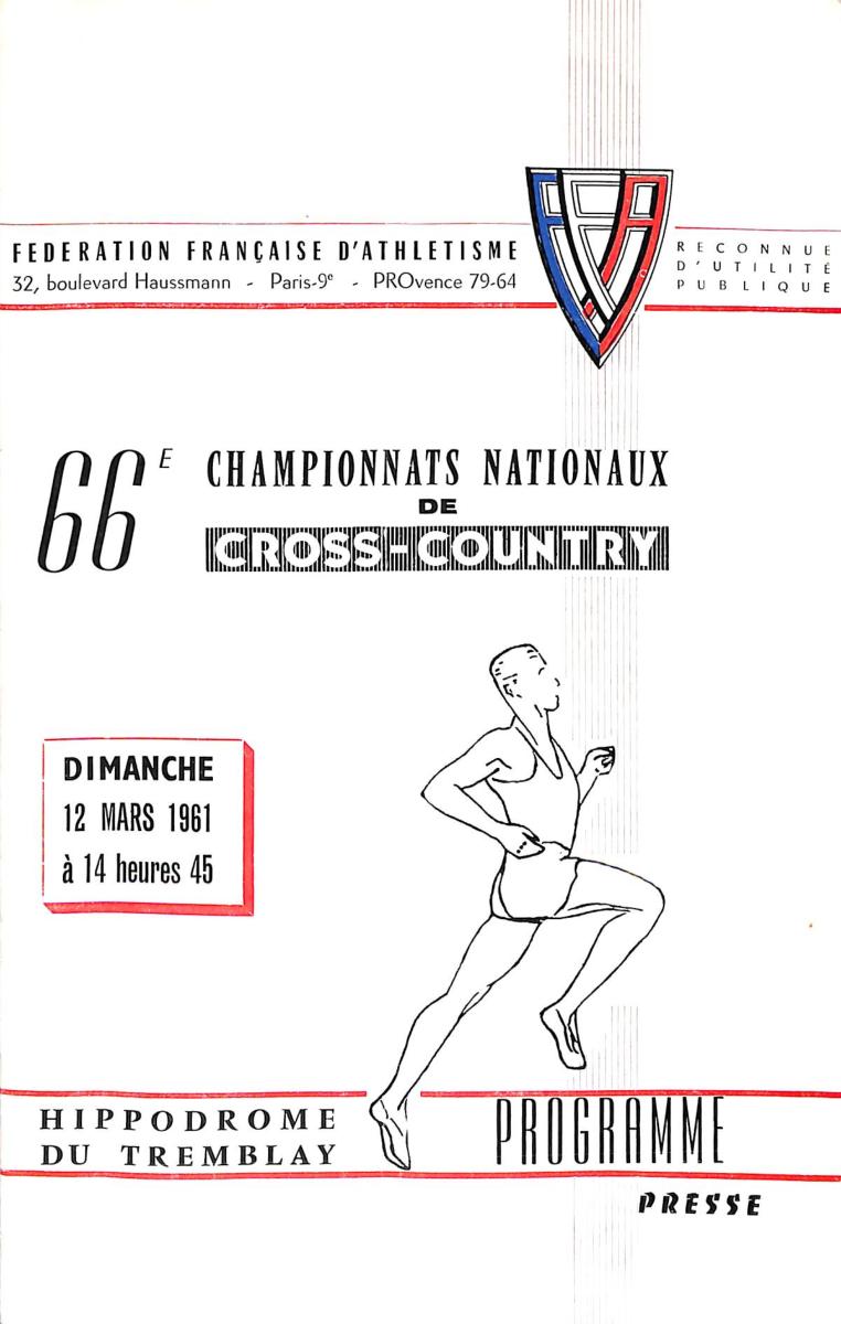 PROGRAMME OFFICIEL 66E CHAMPIONNATS NATIONAUX CROSS-COUNTRY LE 12 MARS 1961 AVEC FEUILLES DE RÉSULTATS. État d'usage.
