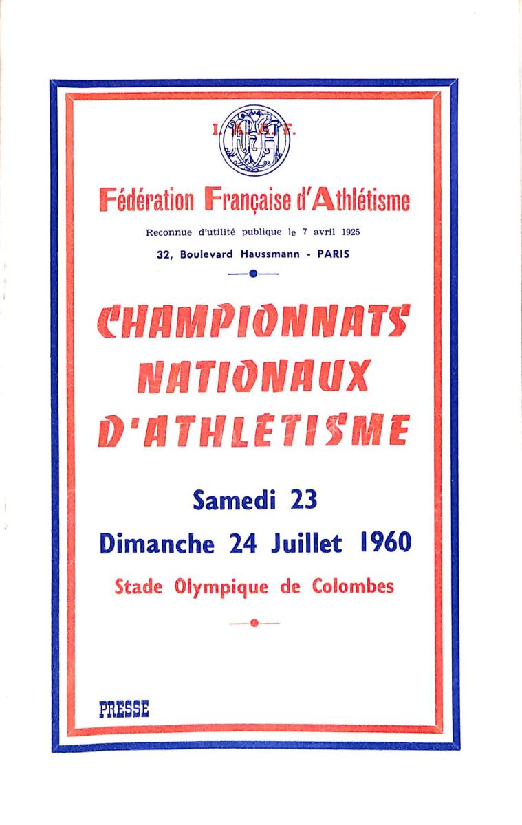 PROGRAMME OFFICIEL CHAMPIONNATS NATIONAUX ATHLÉTISME LE 23 ET 24 JUILLET 1960 ANNOTÉ DE RÉSULTATS. État d'usage.