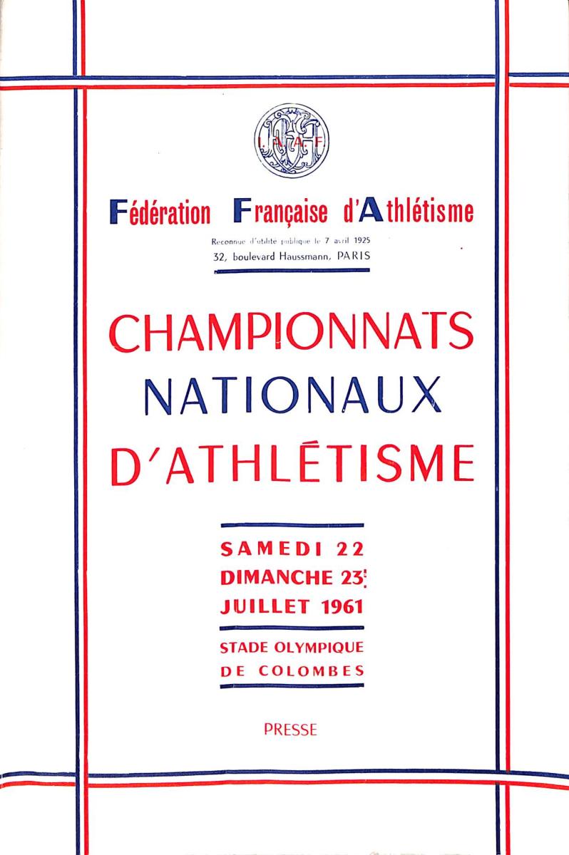 PROGRAMME OFFICIEL CHAMPIONNATS NATIONAUX ATHLÉTISME LE 22 ET 23 JUILLET 1961 ANNOTÉ DE RÉSULTATS. État d'usage.