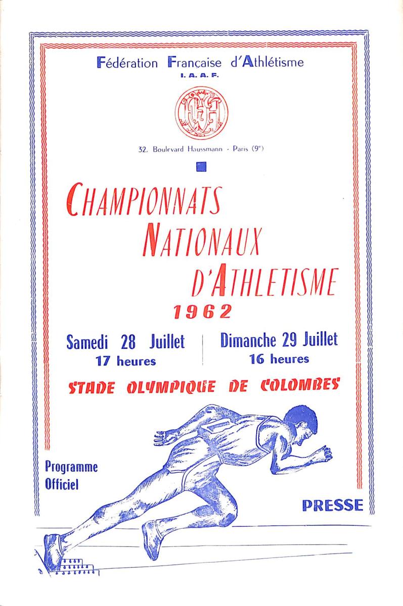 PROGRAMME OFFICIEL CHAMPIONNATS NATIONAUX ATHLÉTISME LE 28 ET 29 JUILLET 1962 ANNOTÉ DE RÉSULTATS. État d'usage.