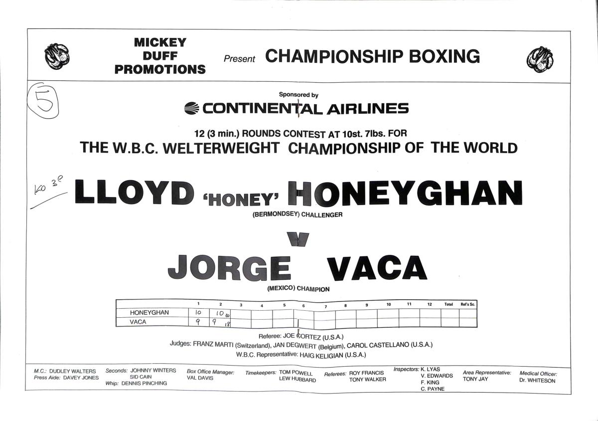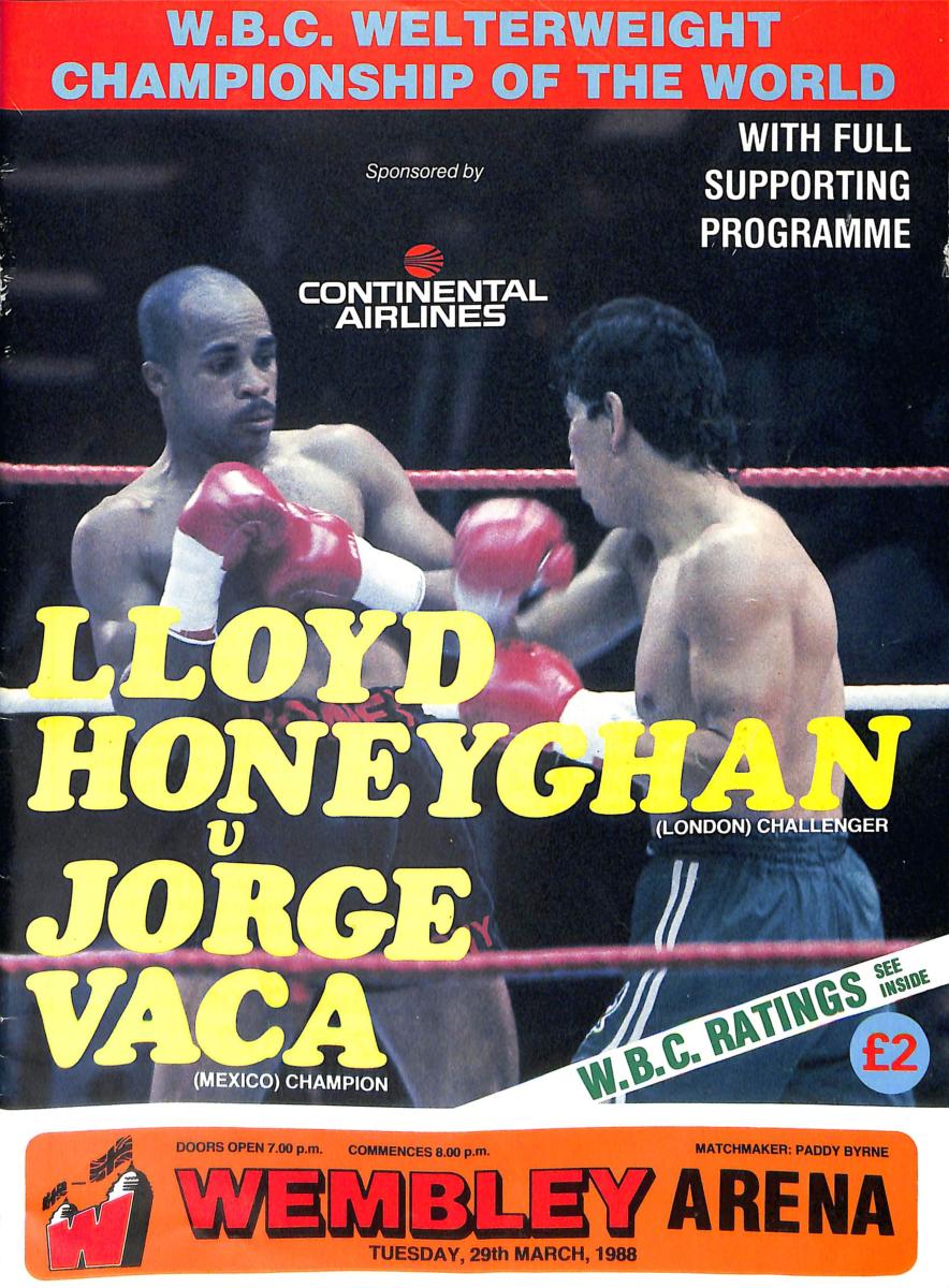 Programme officiel du Championnat du Monde entre Lloyd "Honey" Honeyghan et Jorge Vaca du 29 mars 1988 en anglais. Bon état.