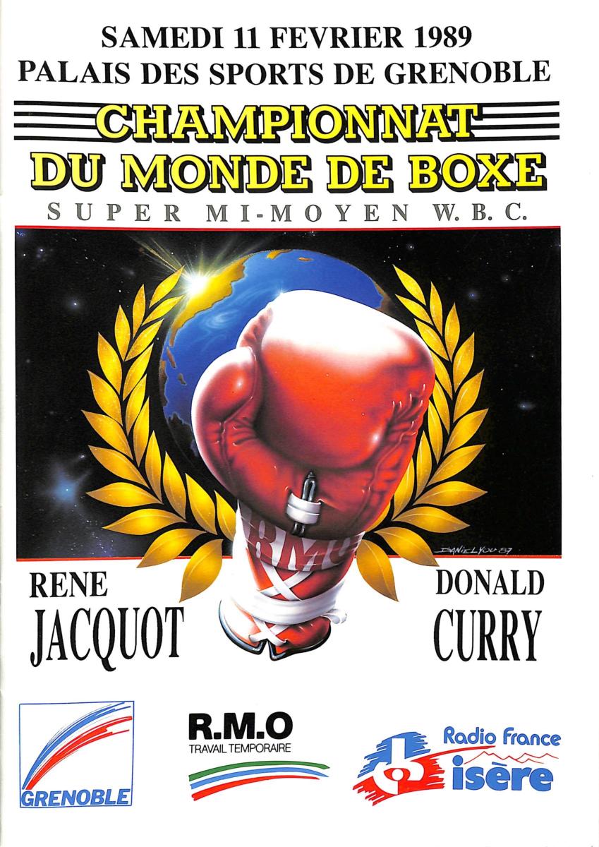 Programme + magazine officiel retraçant le Championnat du Monde entre René Jacquot et Donald Curry du 11 février 1989. Bon état.