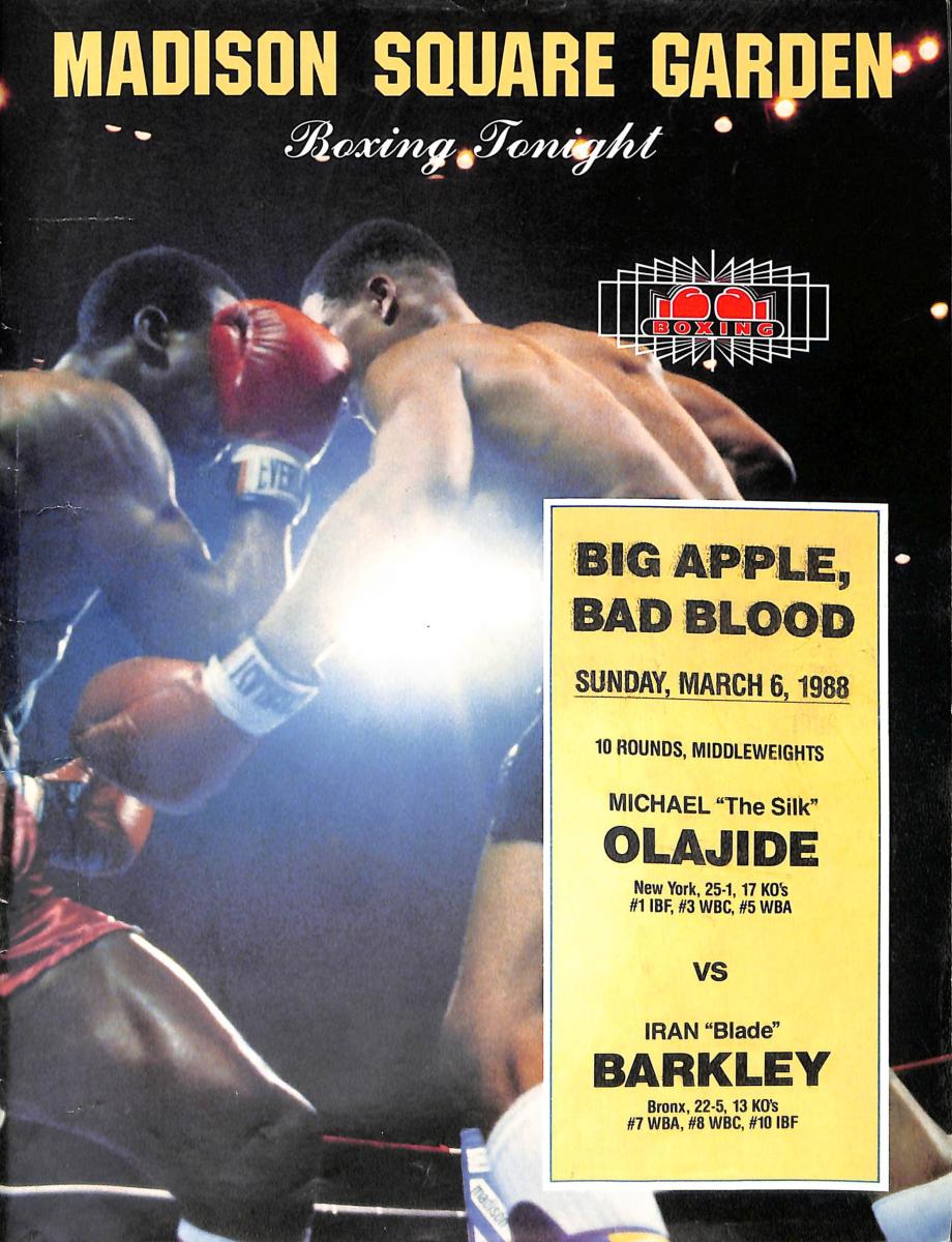 Programme officiel du 6 mars 1988, dont le combat entre Michael "The Silk" Olajide et Iran "Blade" Barkley en anglais. Bon état.