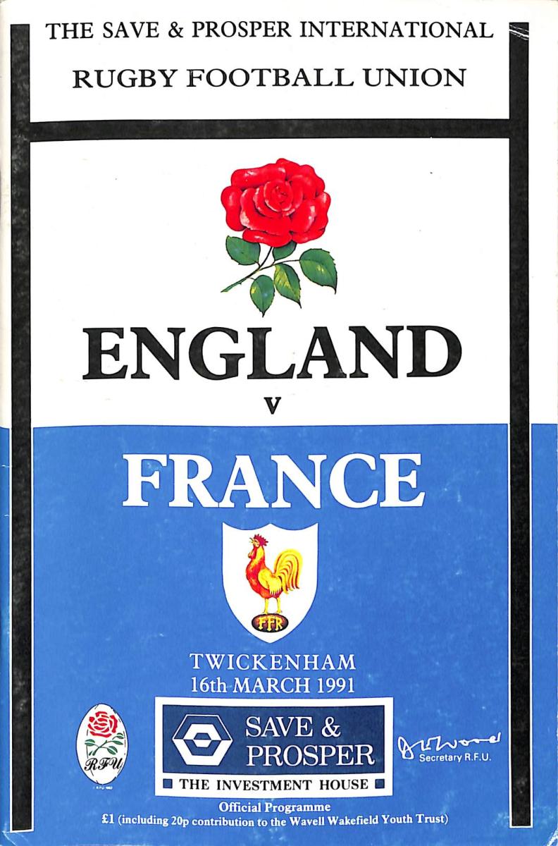 Programme officiel du match opposant l'Angleterre à la France le 16 mars 1991 lors du Tournoi des 5 Nations. État d'usage.