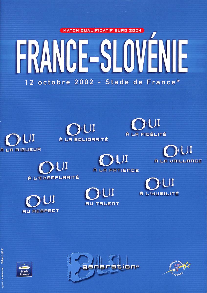 PROGRAMME OFFICIEL DU MATCH ENTRE LA FRANCE ET LA SLOVÉNIE LE 12 OCTOBRE 2002. MATCH DE QUALIFICATION POUR L'EURO 2004. Bon état.