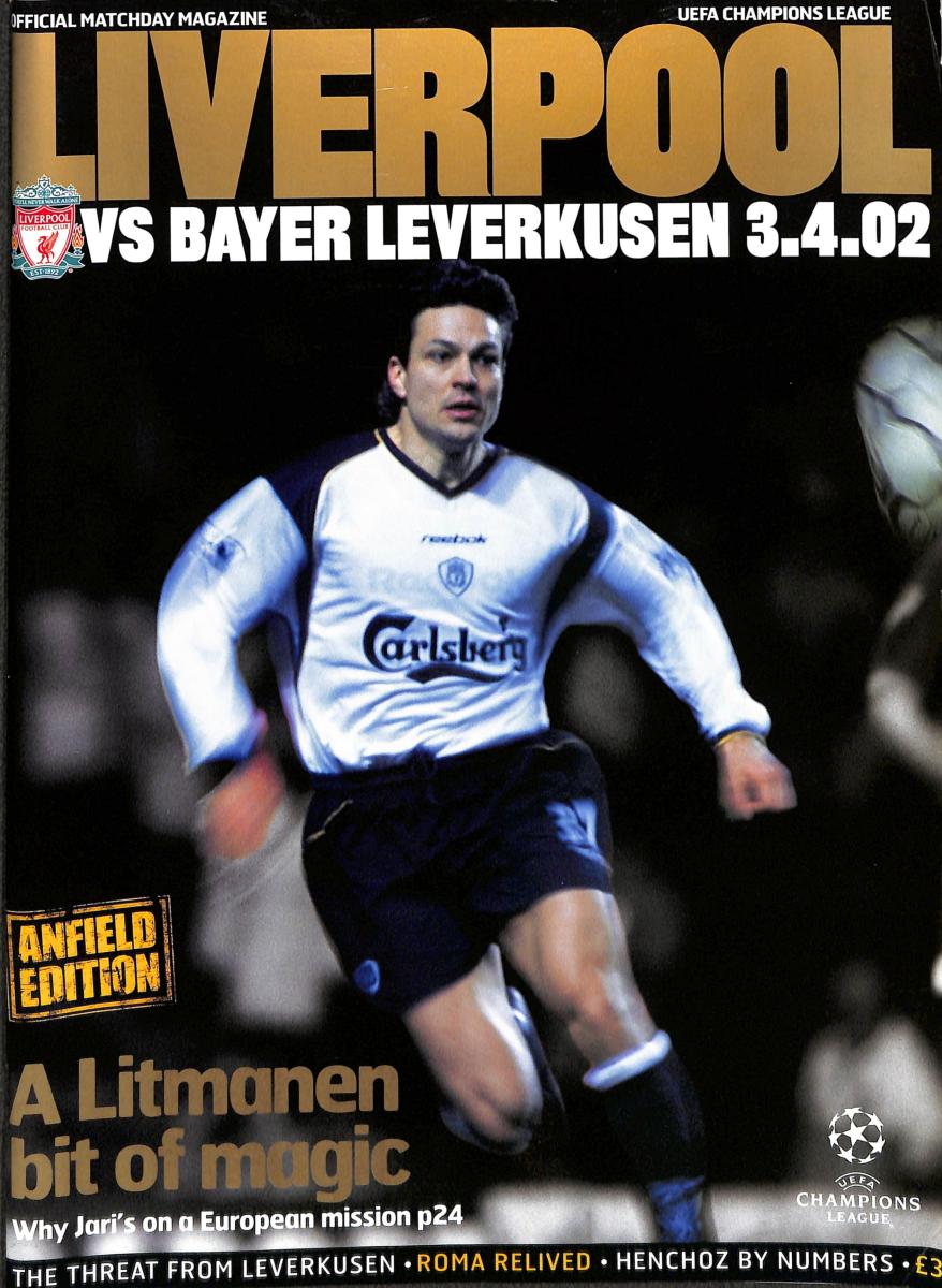 PROGRAMME OFFICIEL DU MATCH ENTRE LIVERPOOL VS LE BAYER 04 LEVERKUSEN LE 3 AVRIL 2002. MATCH DU ¼ DE FINALE ALLER DE COUPE D'EUROPE. Bon état.