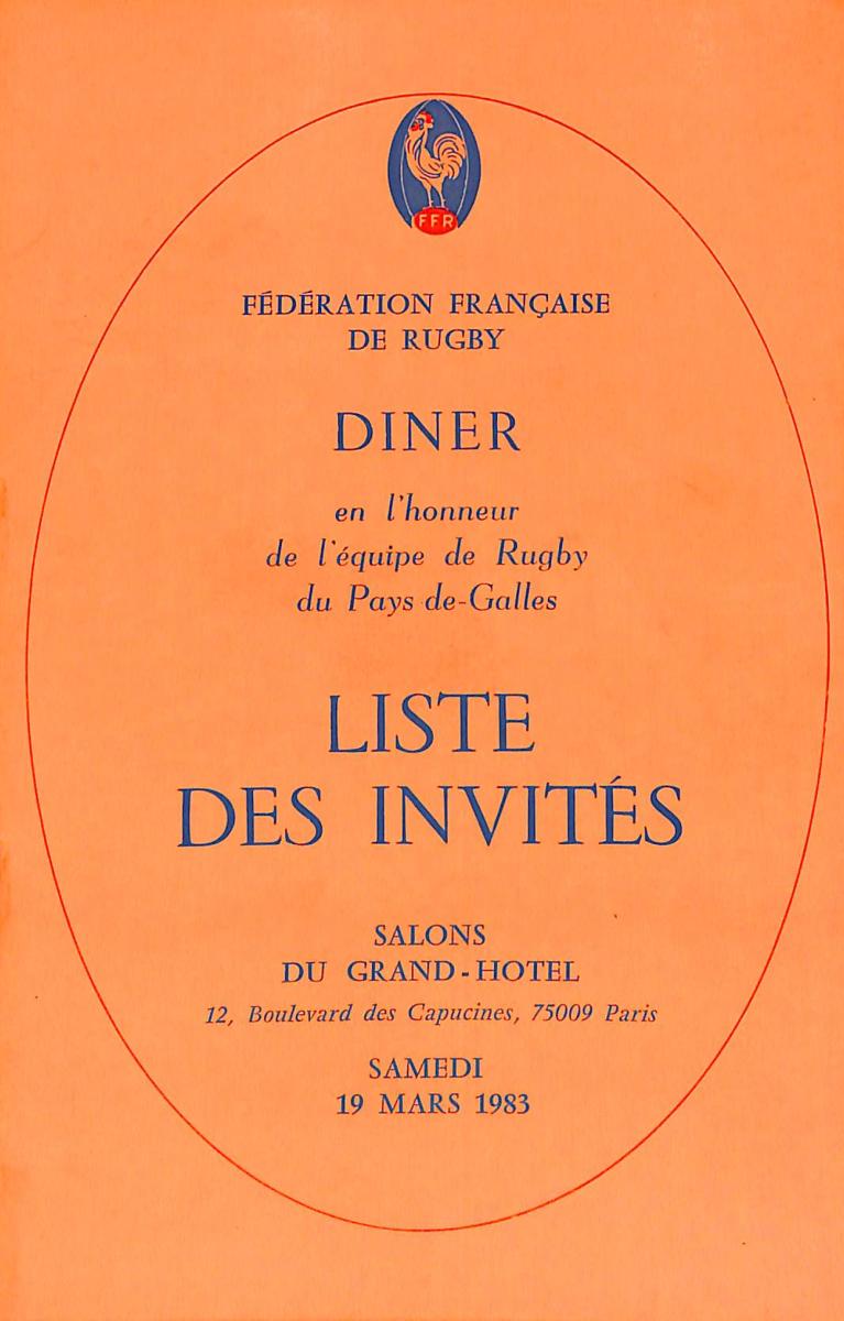 Programme officiel VIP du match opposant la France au Pays de Galles le 19 mars 1983 lors du Tournoi des 5 Nations (Liste des invités en complément). État d'usage.