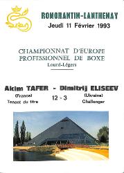 Programme officiel du Championnat d'Europe entre Akim Tafer et Dimitrij Eliseev du 11 février 1993. Bon état. |