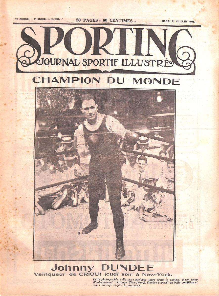 SPORTING N°652 DU 31 JUILLET 1923. Boxe : Johnny Dundee Champion du Monde. État d'usage.
