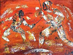 HUILE SUR TOILE "L'ASSAUT" SIGNÉE VIRGINIE LINARD ET DATÉE DE 2009
